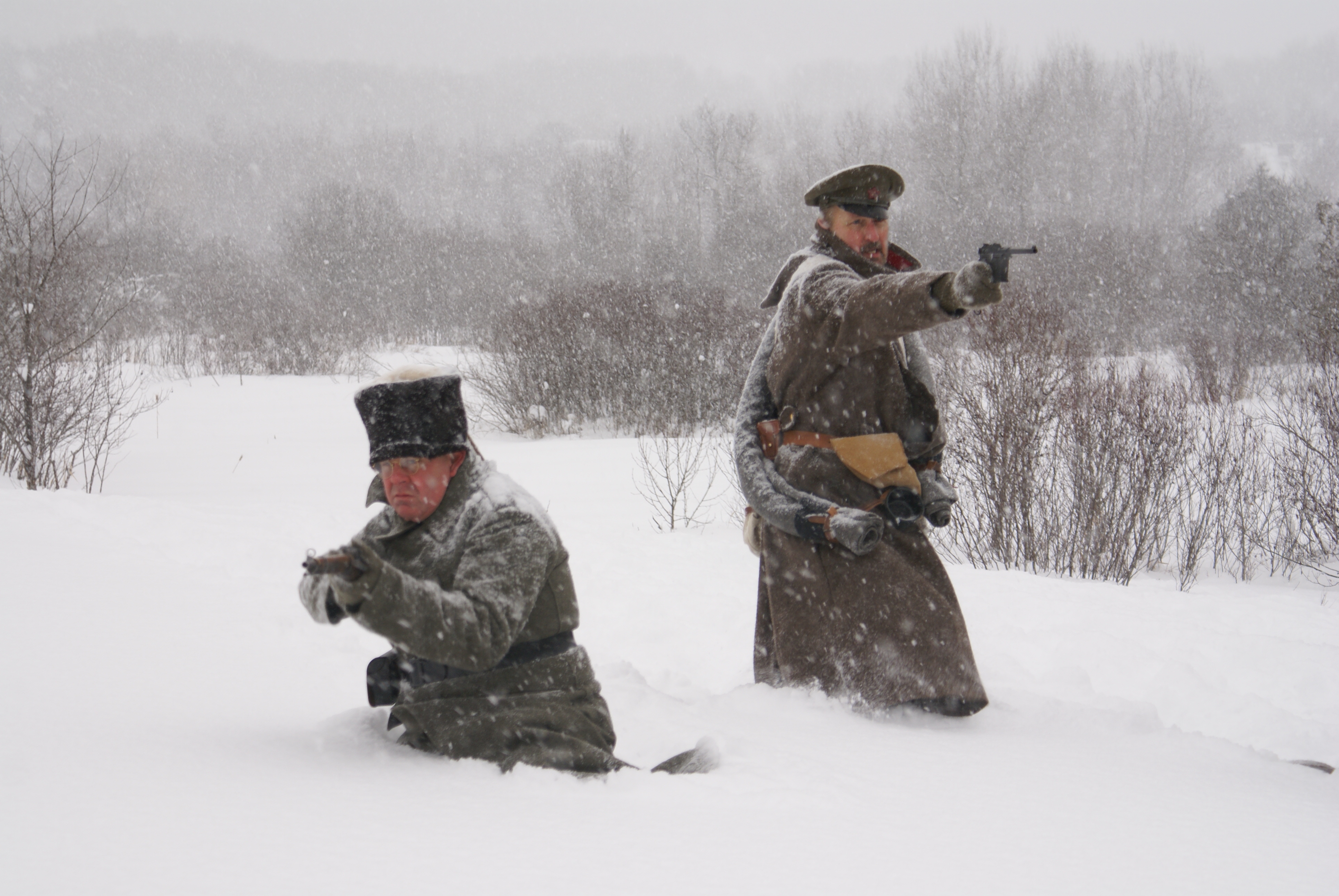 Bolshevik actors and reenactors standing and kneeling in snow and sub zero temperature on a small hillcrest. | |||