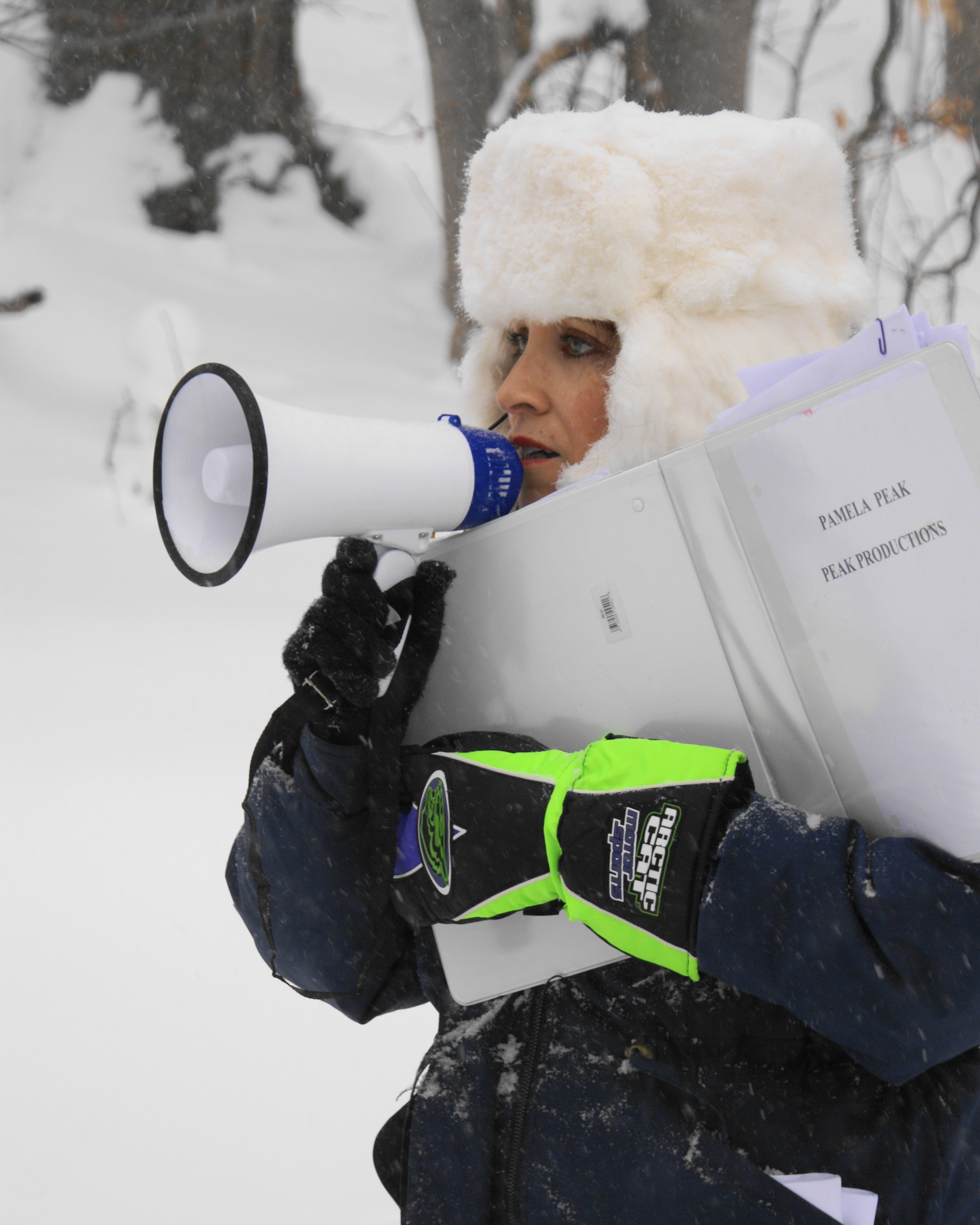 Producer/director Pamela Peak on location in the deep Michigan snow. | |||