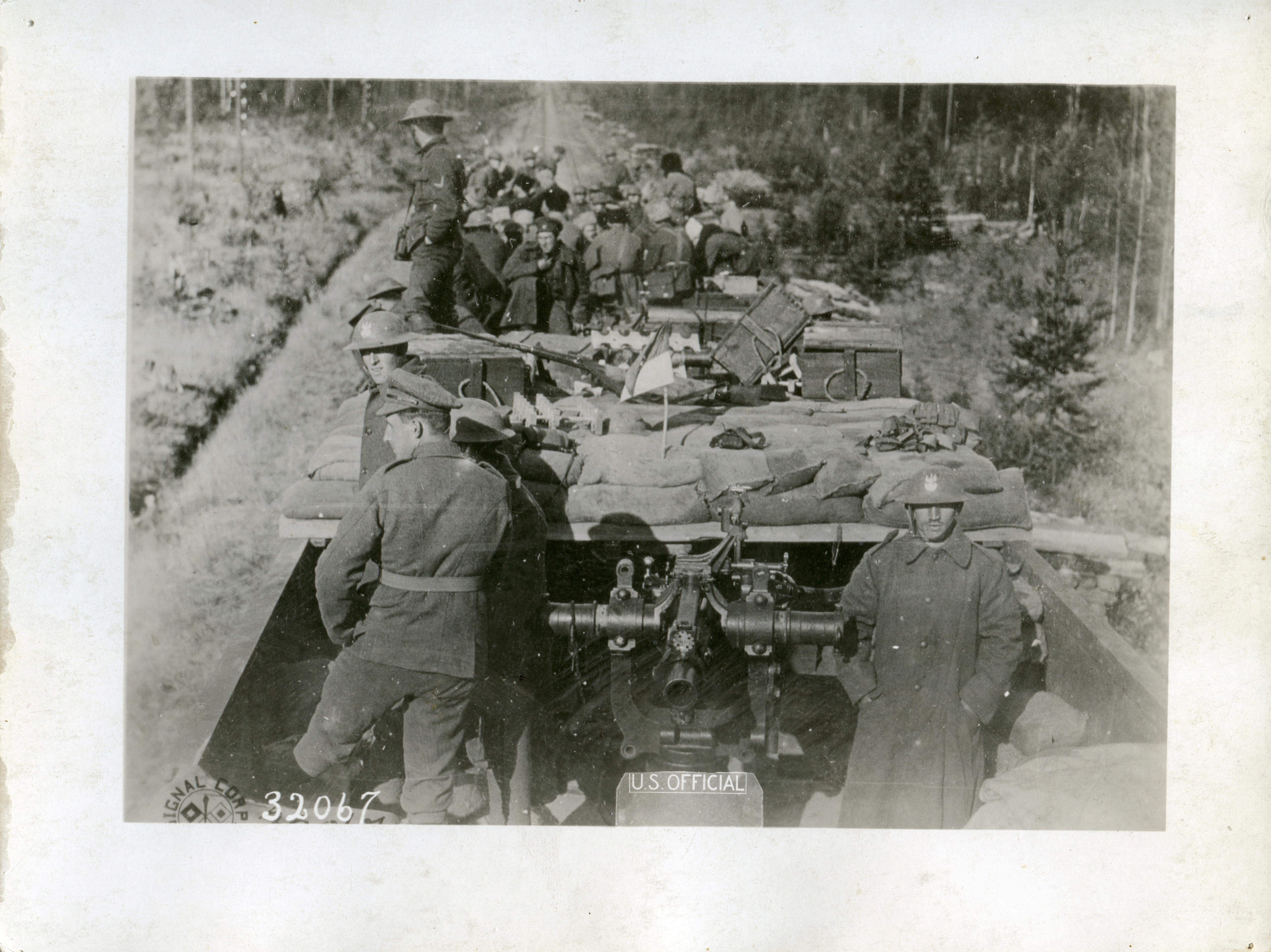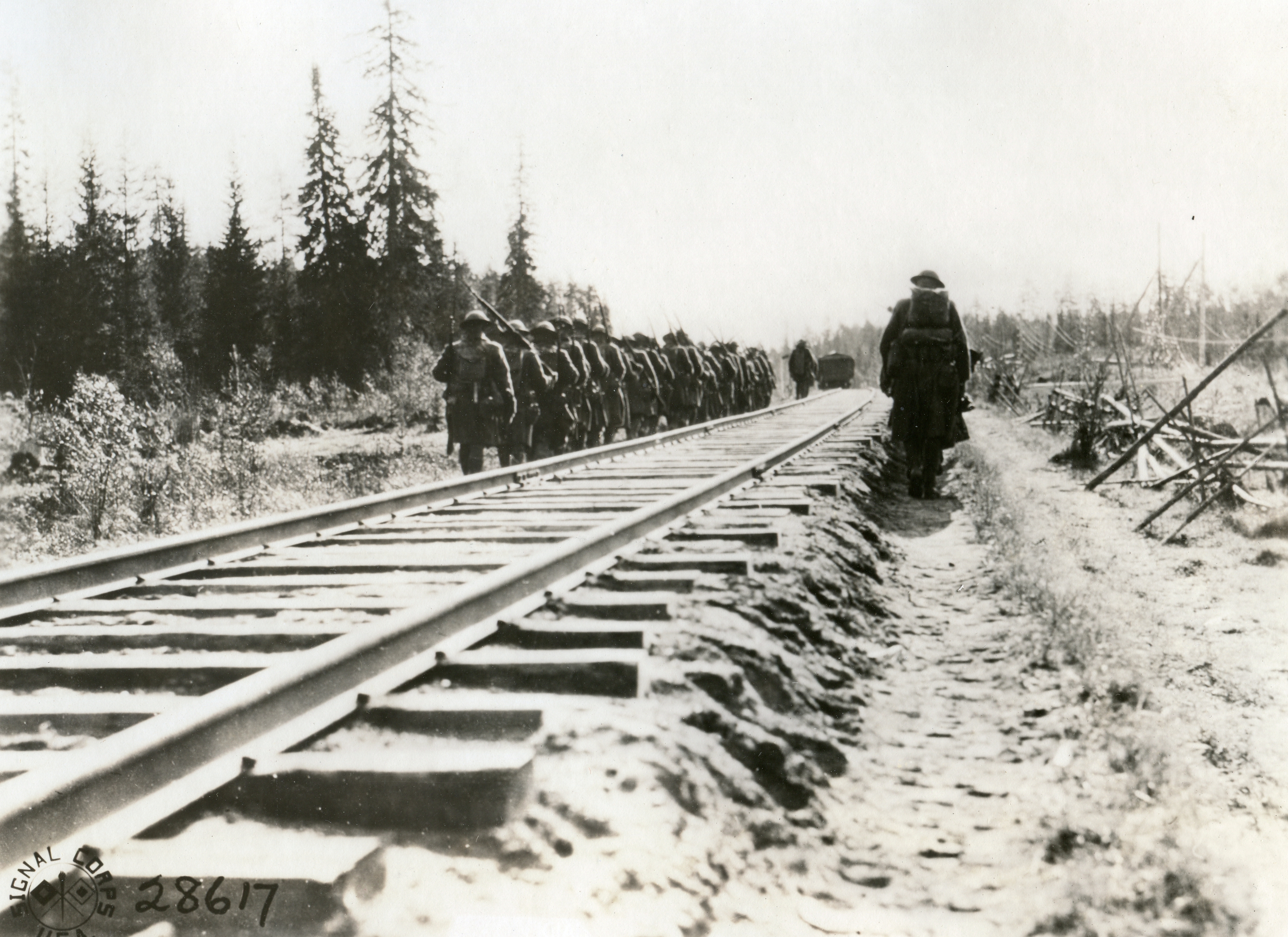 Detroit soldiers being sent down the railroad front soon after being shipped to Northern Russia to fight the first Communistis known as Bolshekviks |